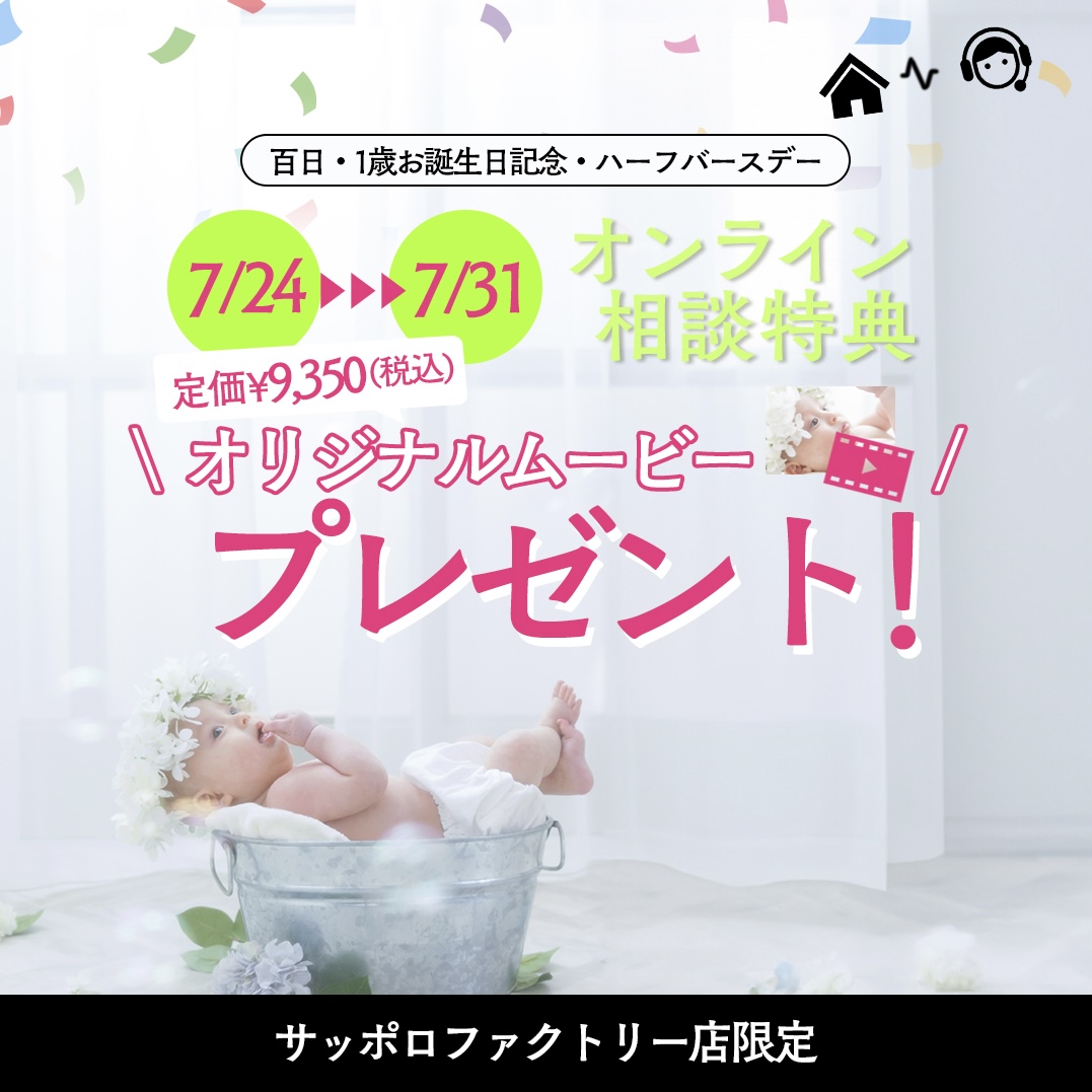 皆様こんにちは!北海道札幌市にある写真工房ぱれっとサッポロファクトリー店です! 今回はベビー撮影をお考えの方必見! 7/24~7/31の期間中にオンライン相談をしてくださったお客様にオリジナルムービーをプレゼント 一週間限定のお得なキャンペーンです! ぜひ最後までお付き合いください!