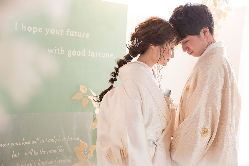 白無垢ですと、白を基調にしたお花や色打ち掛けですと着物に合わせた色味がオススメです♡