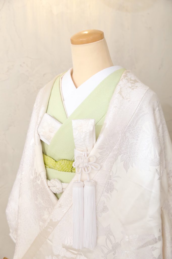 全体が淡いグリーンなので白無垢に合わせるとスッキリ爽やかな印象になります・:*+.