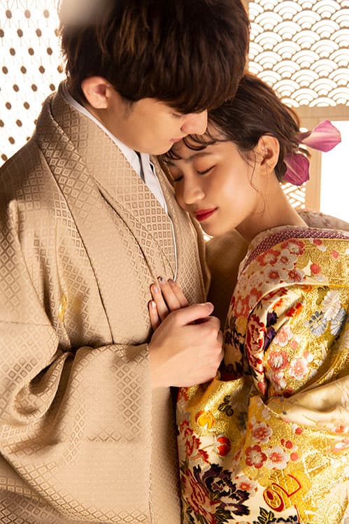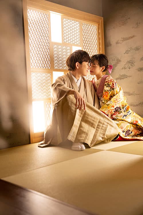 組子の障子の前に座る二人は、まるで歴史の一部から抜け出したような風情ある雰囲気に仕上がります。