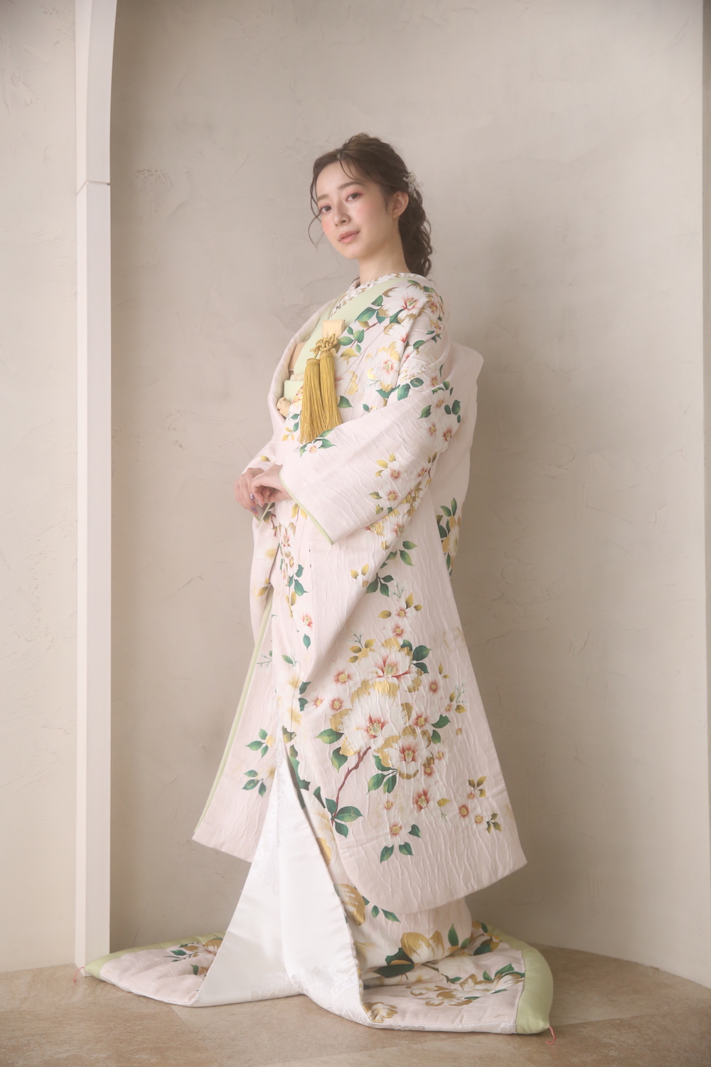 こちらの新しく入荷した色打掛けはボタニカルのフラワーに相性ぴったりのお衣装になっています・:*+.