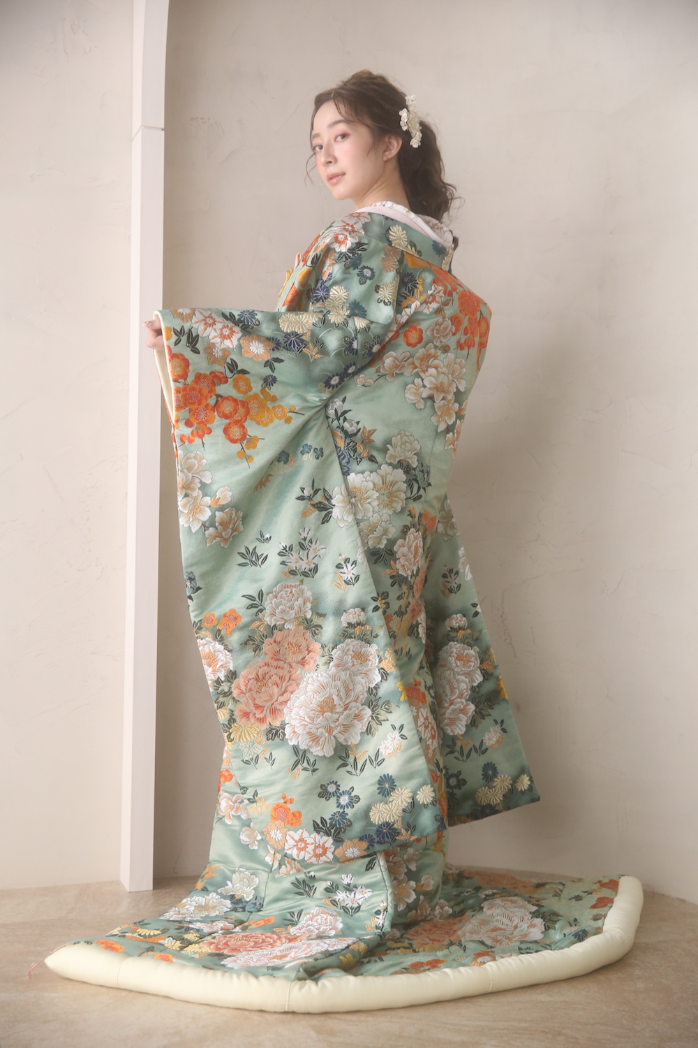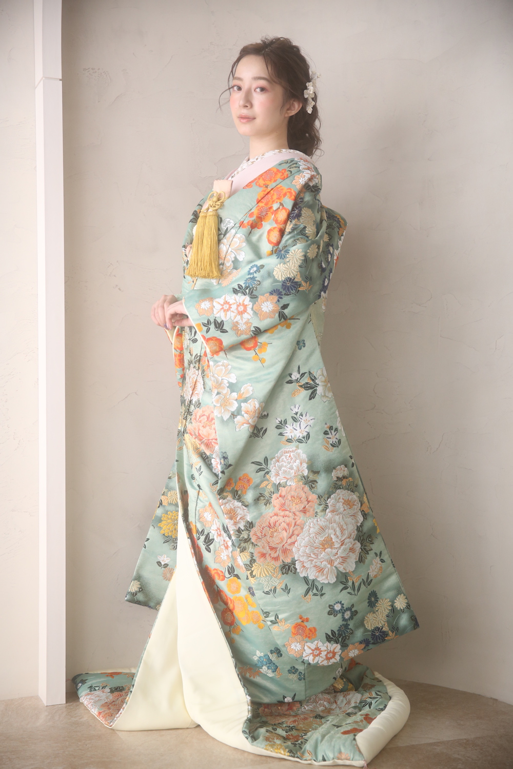 打ち掛けでは珍しいエメラルドグリーンに淡いピンクの掛下を合わせております・:*+.