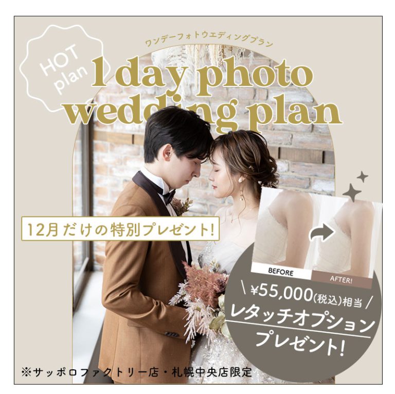 1dayフォトウェディングプラン限定で大変お得なレタッチオプションが12月末までの限定特典で、1ランク上のブライダル撮影が大変特になっております・:*+. ぜひ参考にしてください!