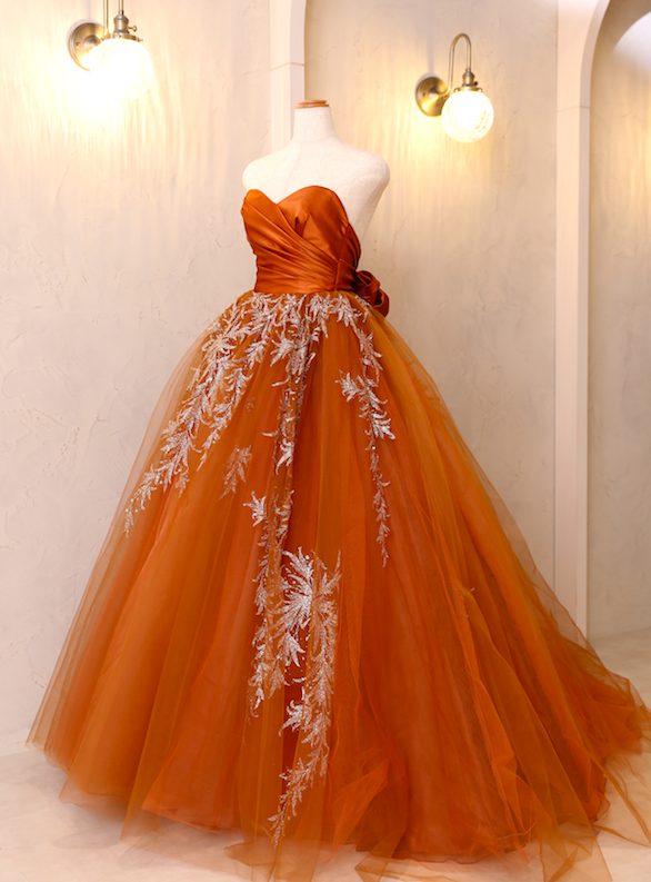 鮮やかなテラコッタ色が目を引く、印象的なドレスです!!