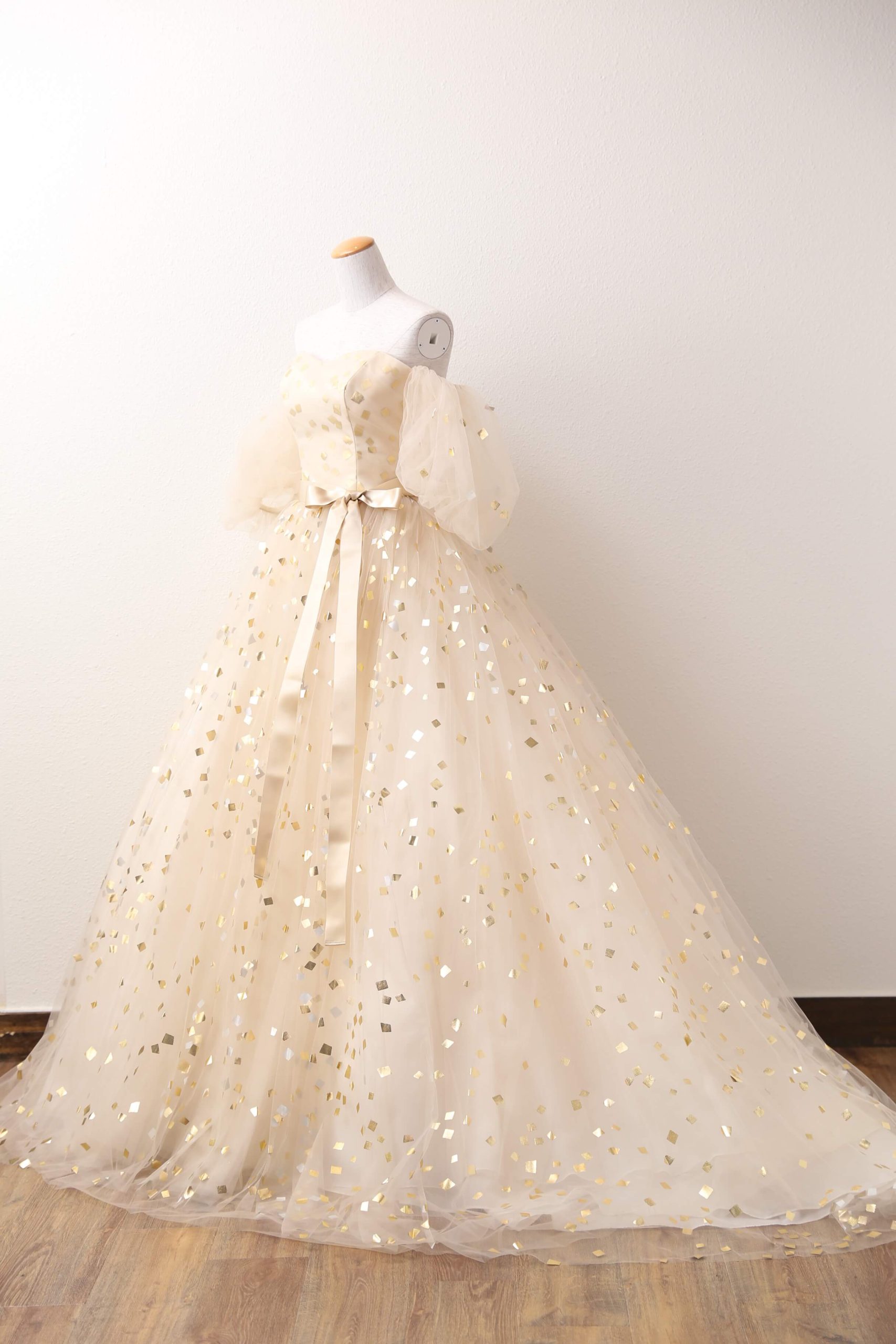 明るいベージュのレース生地に、ゴールドの模様がちりばめられたドレスです!!