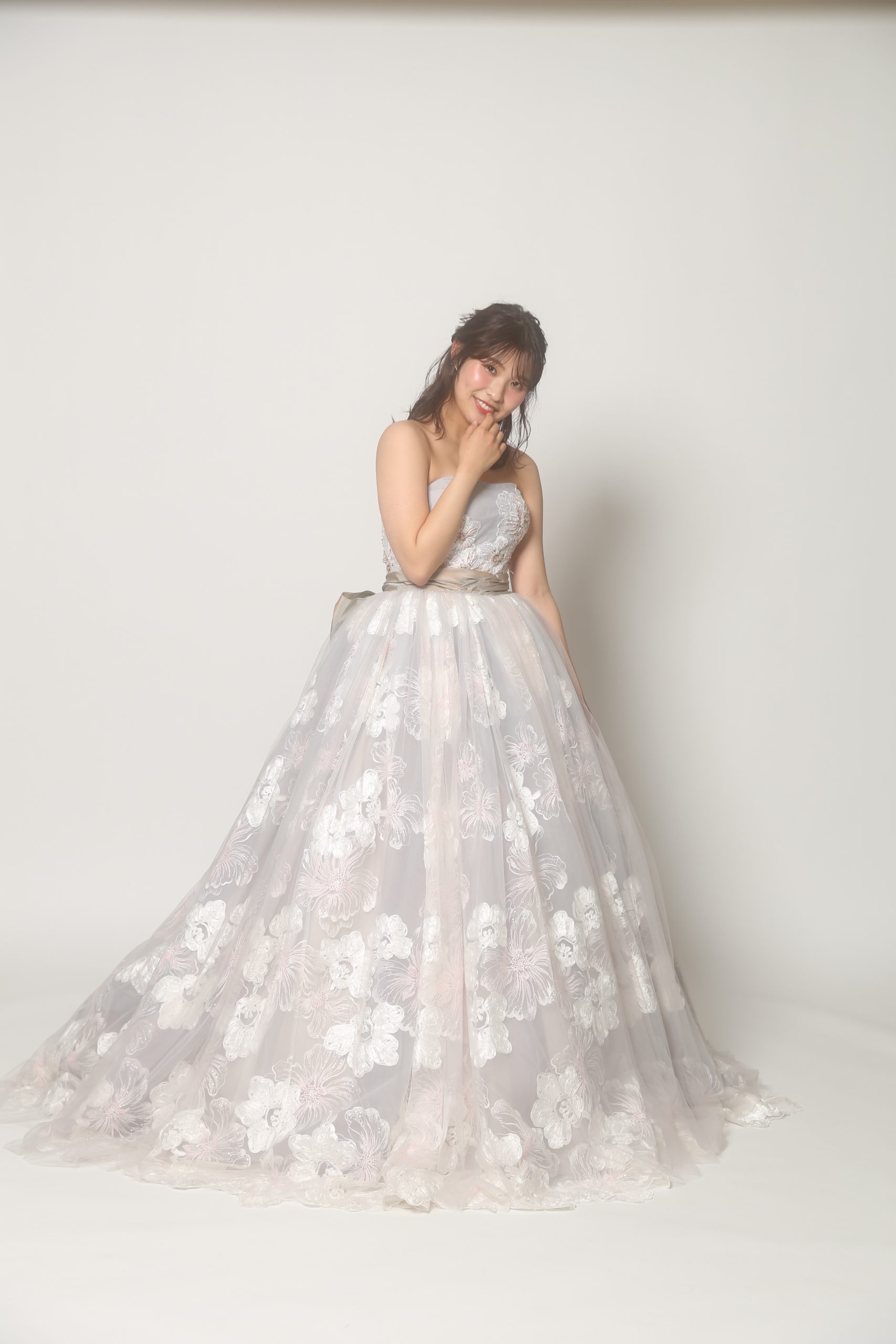 薄いグレーの生地に白とピンクのお花が刺繍されたドレスです♡