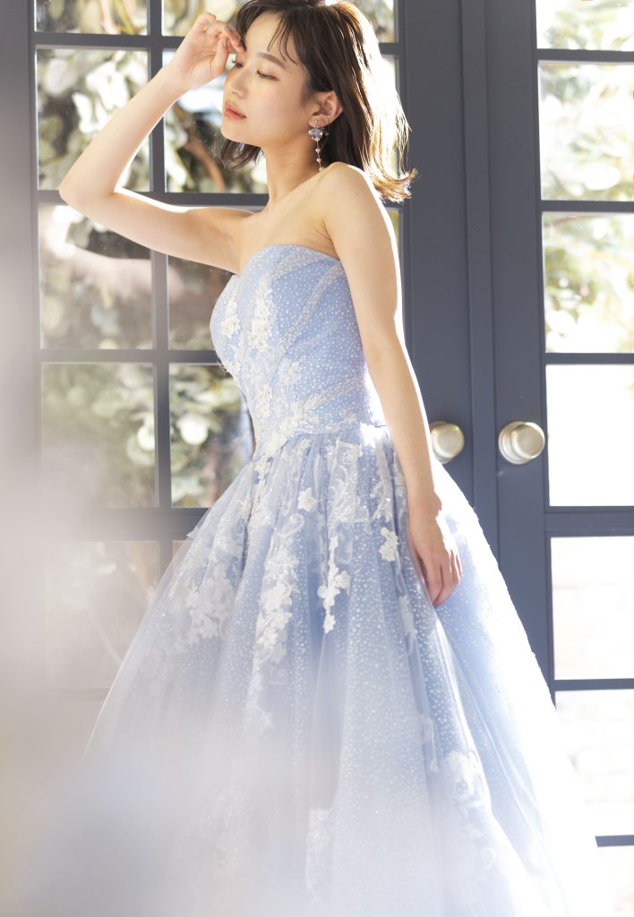 こちらはアイスブルーのお色味と華やかなチュールのトレーンがポイントの1着。