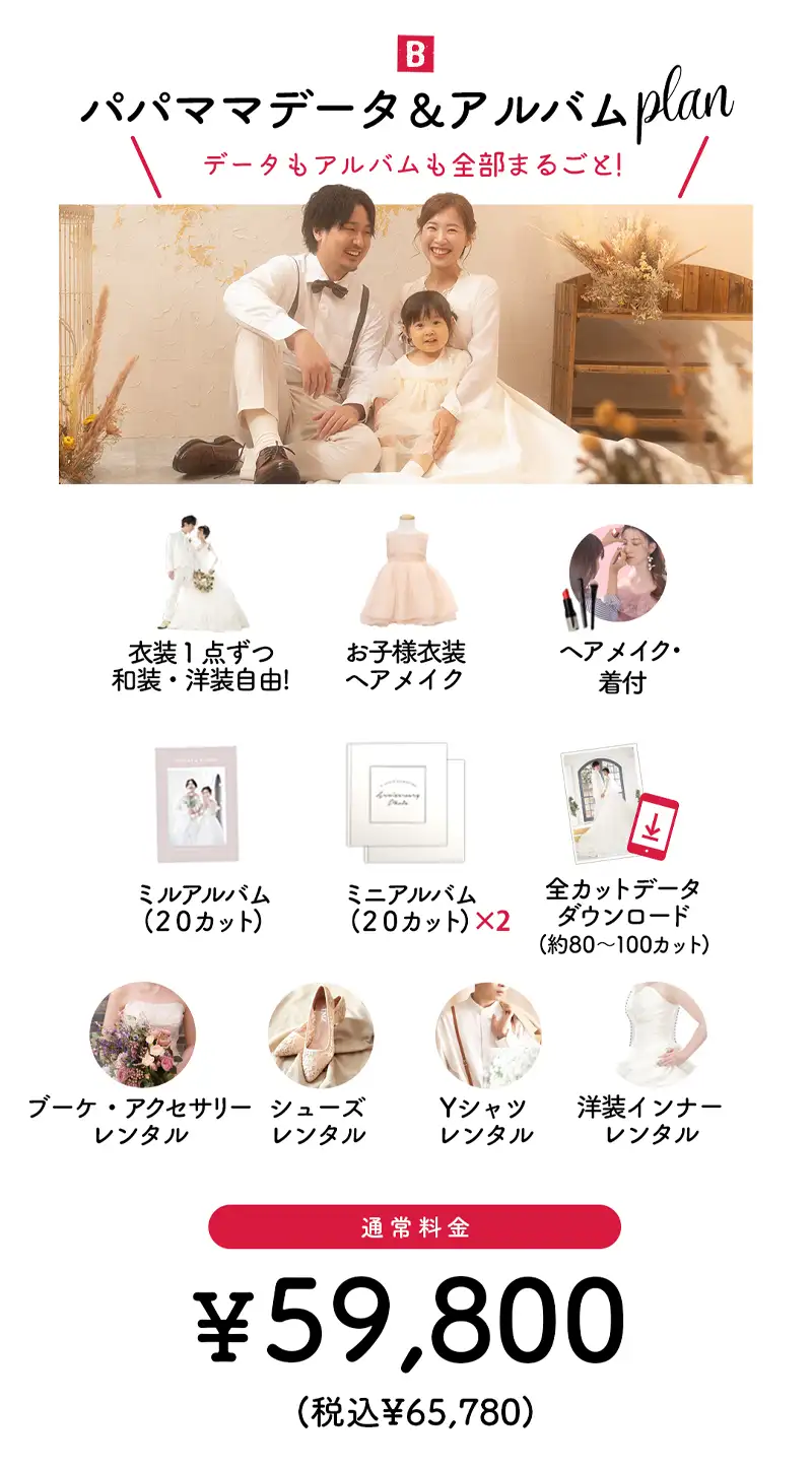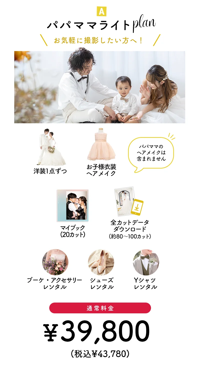 「カジュアルフォトウエディングプラン」または「ファミリーオプション(税込¥11,000)」追加により可能です。