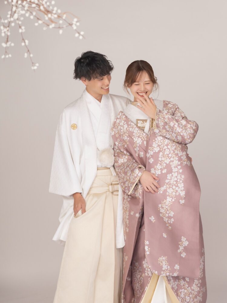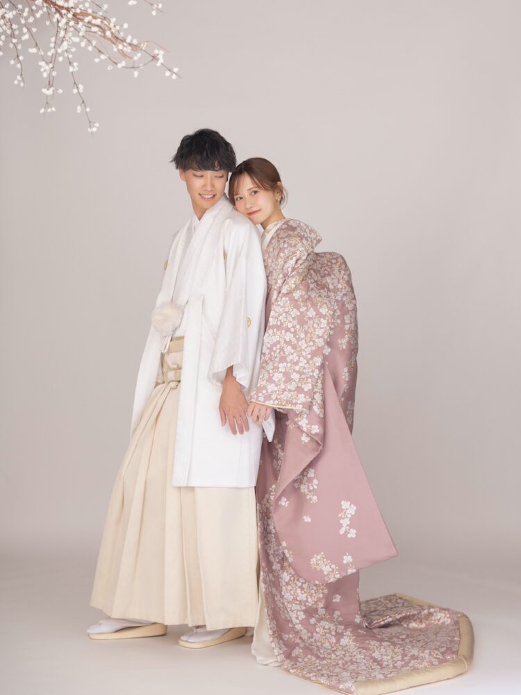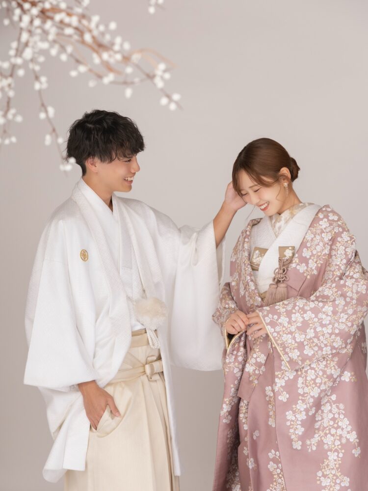 お嫁様が淡い色味をセレクトした時は、お婿様も白やグレーなど淡い色味がおすすめ。