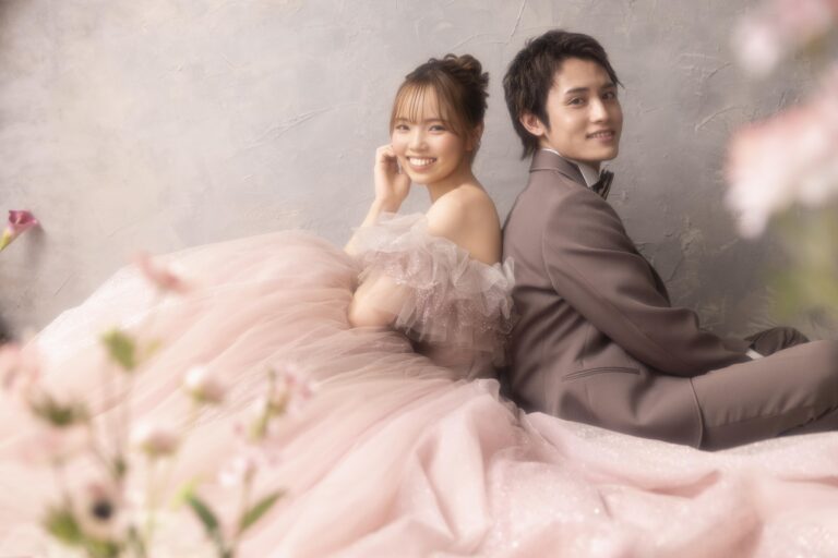 フォトウェディングには、ふんわりとしたチュールやボリュームスカートのピンクドレスが映えます。