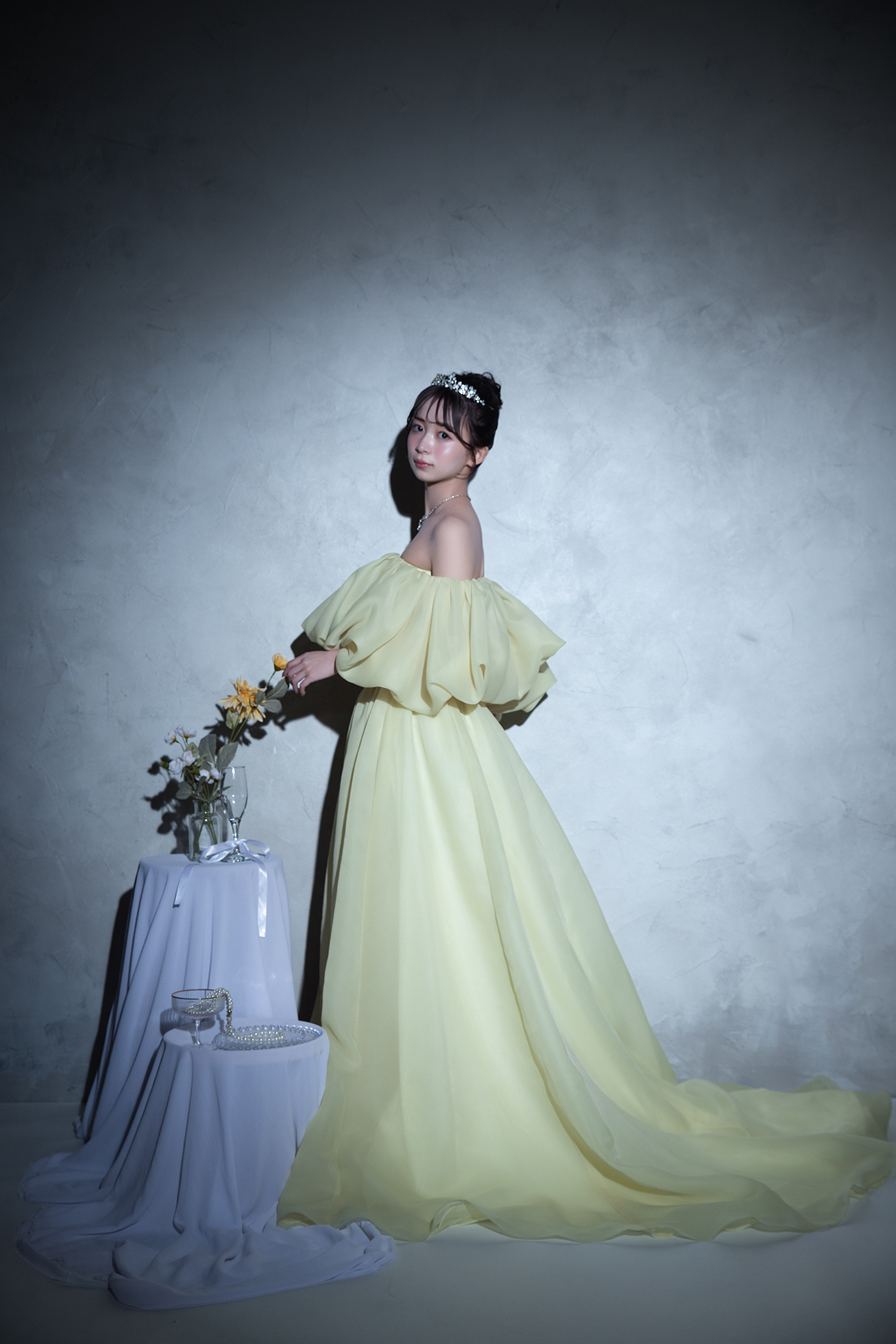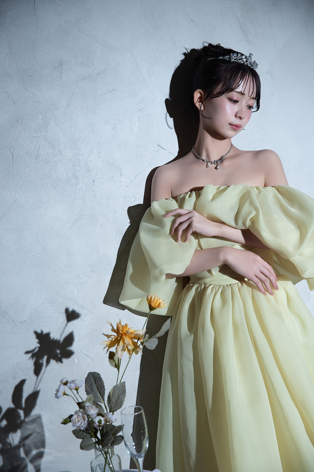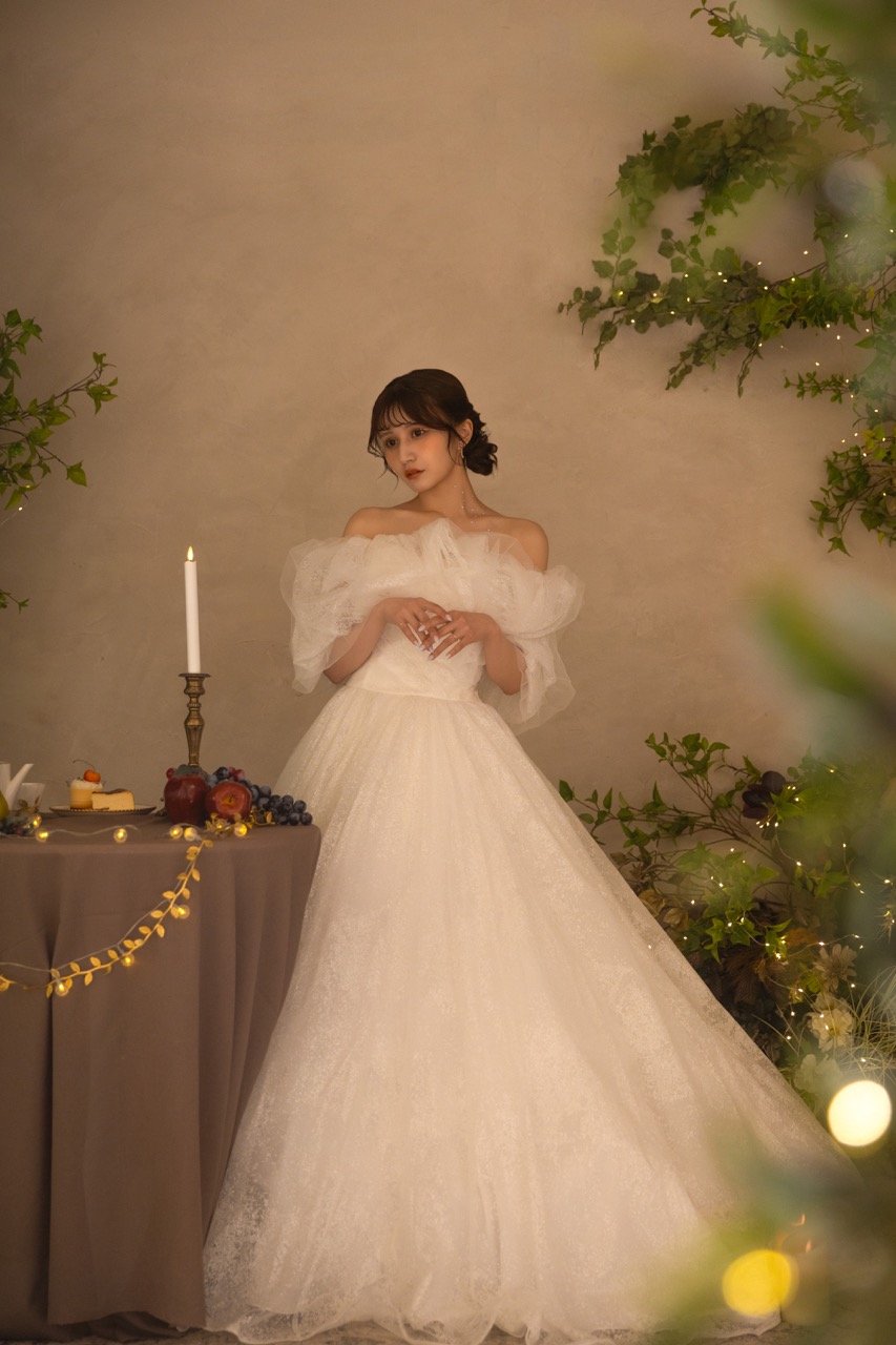ふんわりとした胸元のデザインやボリューム感のああるドレスラインが華やかさを演出します。