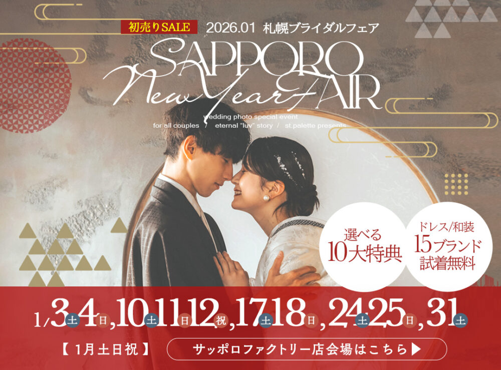 皆さんこんにちは!札幌のフォトウェディングスタジオ 写真工房ぱれっとサッポロファクトリー店です。 この度、2026年1月の毎週末に【札幌ブライダルフェア】の開催が決定いたしました!! 最新衣装の見学&無料試着会や、嬉しいプレゼント、限定特別プランを多数ご用意しております! 是非、大切な方をお誘い合わせの上ご来場をお待ちしております♡