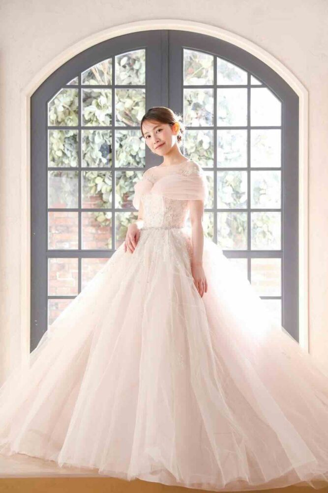 淡いベージュカラーのチュールが肌を綺麗に見せてくれるドレス。