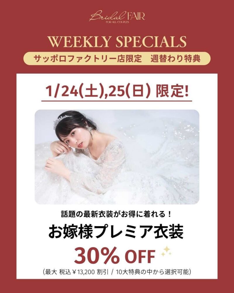 1月24、25日の週替わり特典は「お嫁様プレミア衣装30%オフ」です!