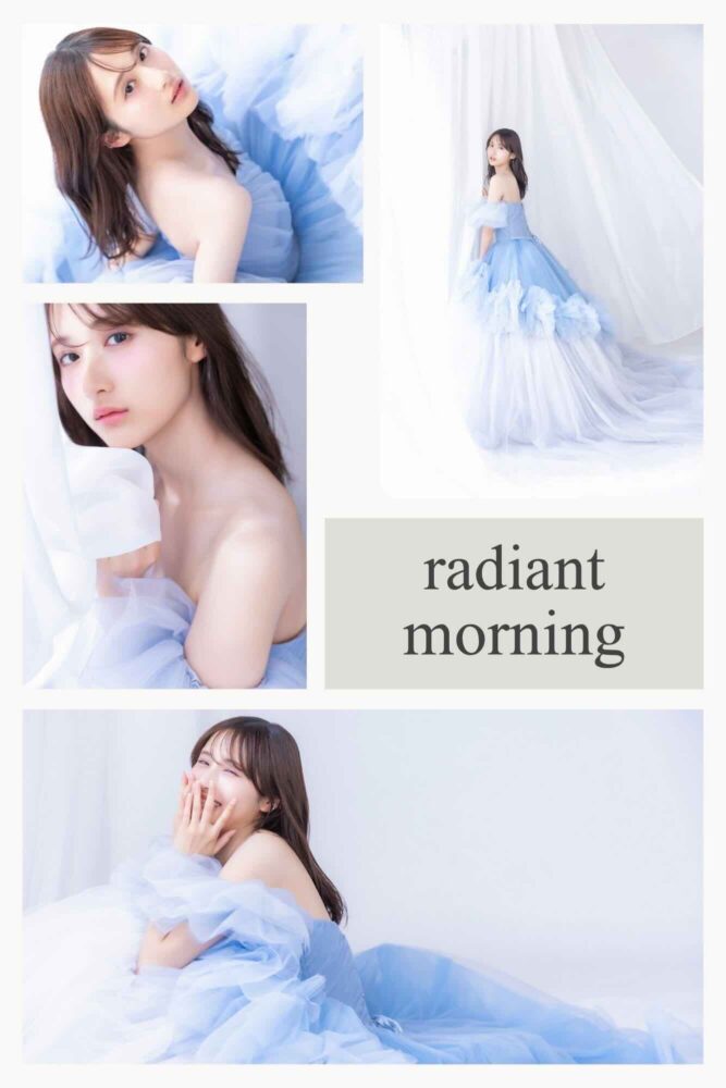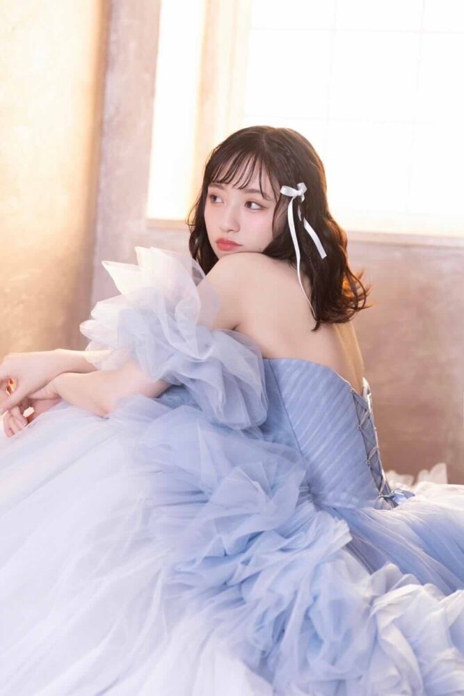 柔らかな光が差し込むようなシンプルな背景は、ドレスの繊細な色味や素材感をそのまま写真に残してくれます。