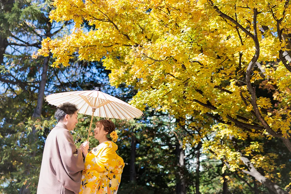 スタジオ撮影だけでなく、歴史的建造物でのロケーション撮影も色打掛には最高にマッチします。 札幌エリアの「永山邸」や「北海道庁赤レンガ庁舎」といったスポットは、重厚感のある色打掛と相性抜群です。
