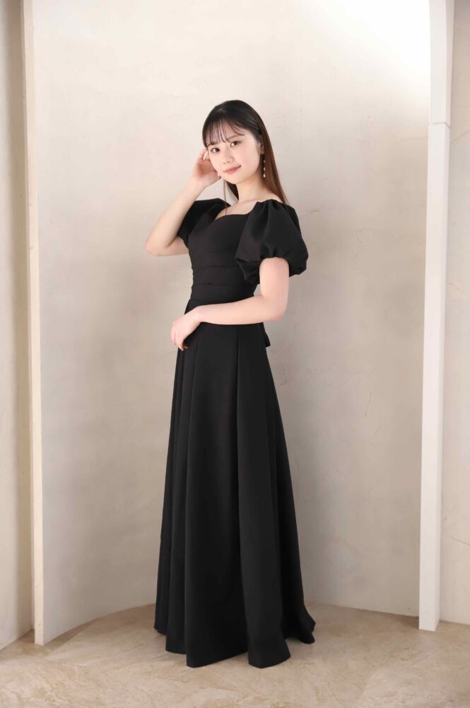 光沢感のある美しいブラックの生地、パフスリーブ袖とマーメイドシルエット。
