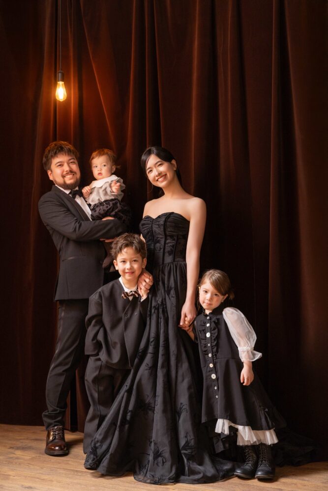 お父様はシックなタキシード、お母様はモダンなブラックドレス、そしてお子様も黒を基調としたお洋服で合わせることで、家族の絆がぐっと引き立つ「一体感」が生まれます!
