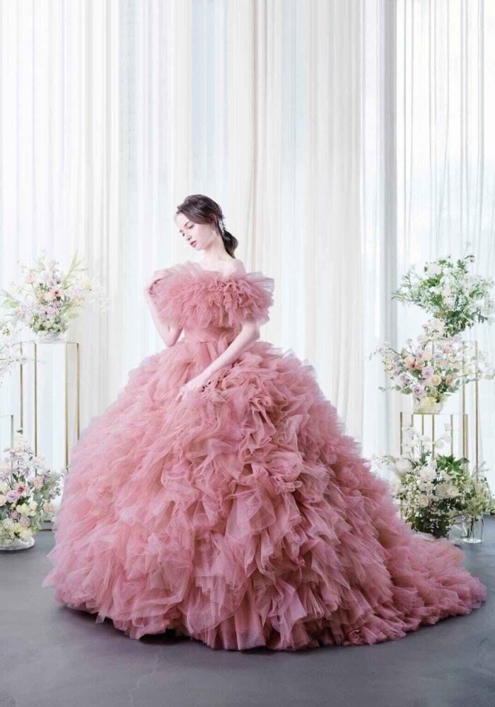 袖やチュールを組み合わせてシックで可愛らしくも美しくも着こなせる、麗しいデザイン性と色合い。