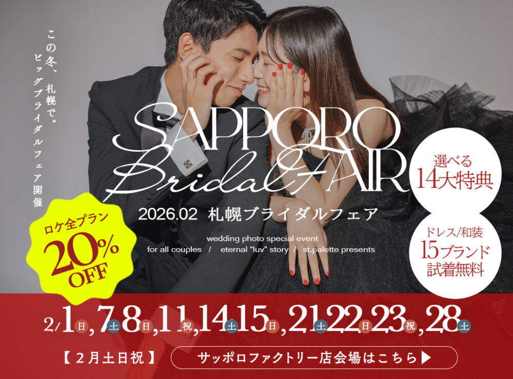 皆さんこんにちは! 札幌のフォトウェディングスタジオ 写真工房ぱれっとサッポロファクトリー店です。 この度、2026年2月の毎週末に【札幌ブライダルフェア】の開催が決定いたしました!! 最新衣装の見学&無料試着会や、嬉しいプレゼント、限定特別プランを多数ご用意しております! 是非、大切な方をお誘い合わせの上ご来場をお待ちしております♡