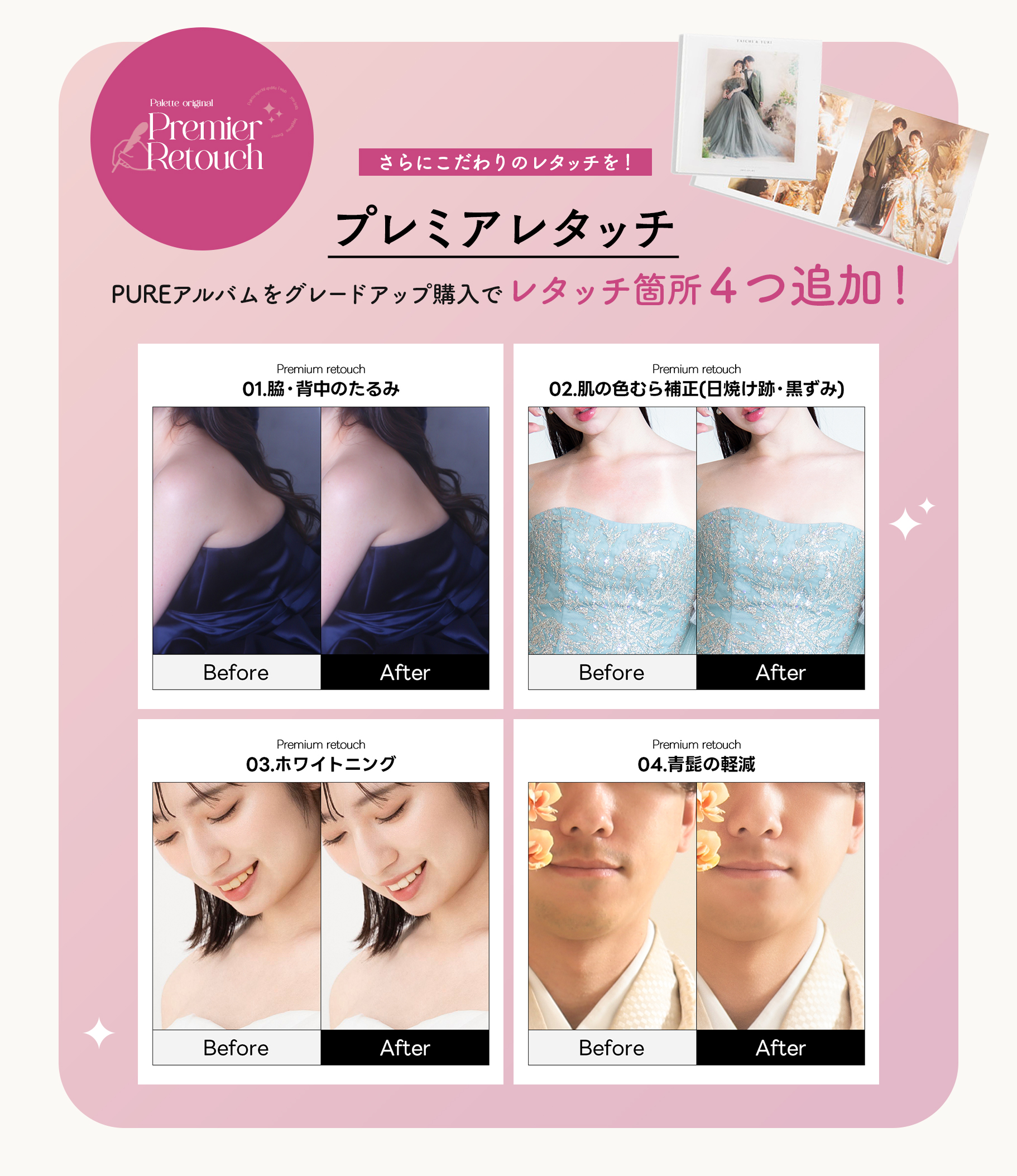 さらに、「PUREアルバム」へのグレードアップ購入を選択された場合は、プレミアレタッチ(合計10箇所)へとアップグレードされます。