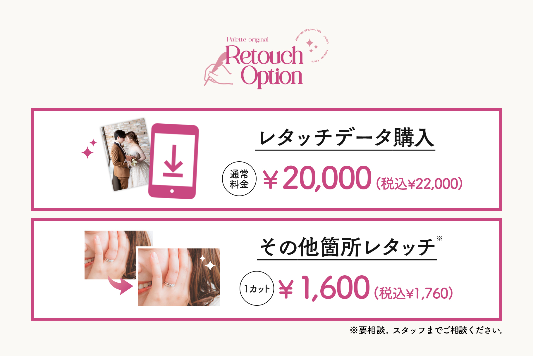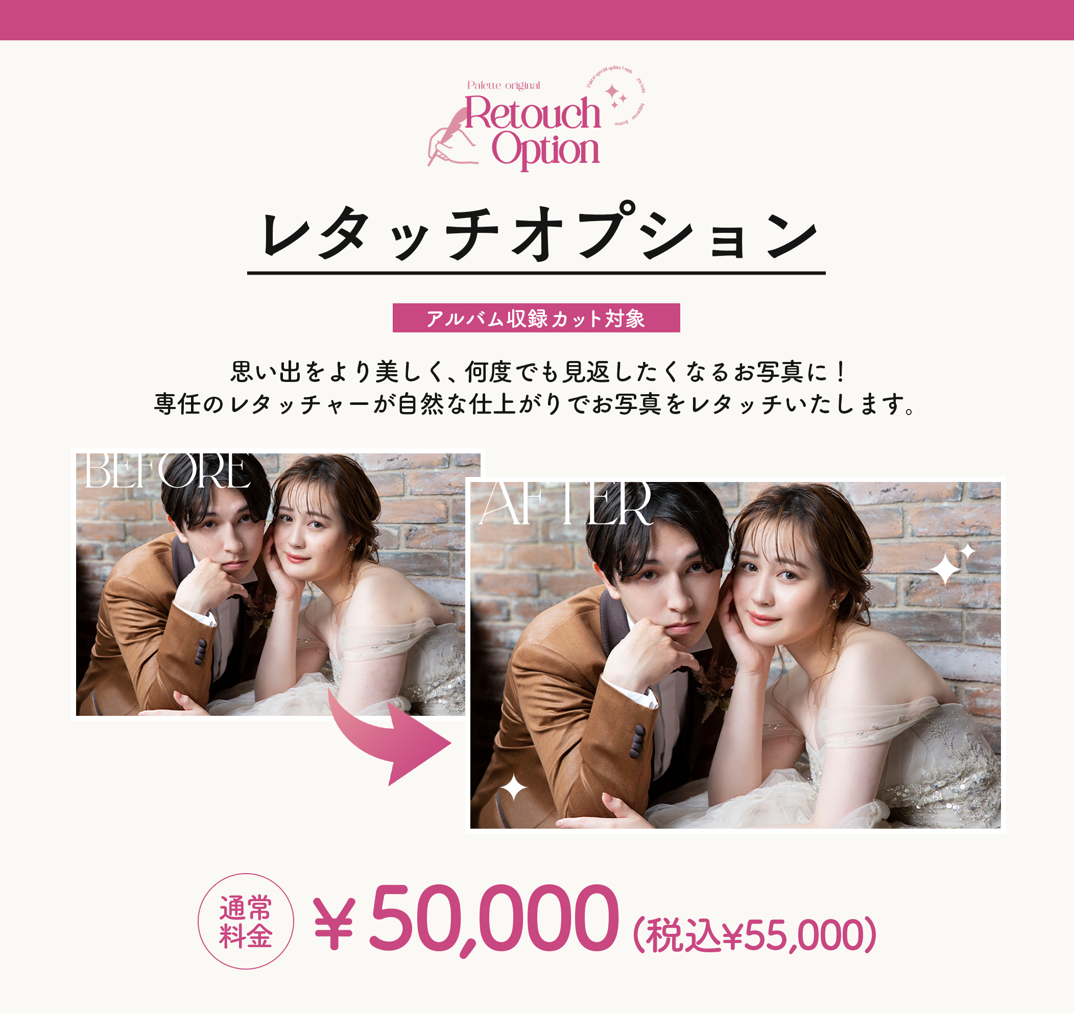 「1dayアルバムプラン」をご契約のお客様に対し、通常価格 ¥50,000(税込¥55,000)のスタンダードレタッチオプションを無料!