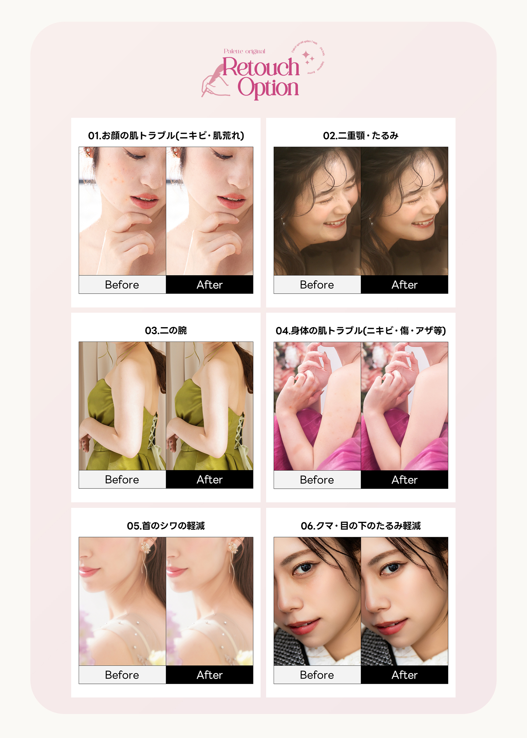 当日の撮影を心からの笑顔で楽しむために、このレタッチオプションは大きな味方となるはずです!