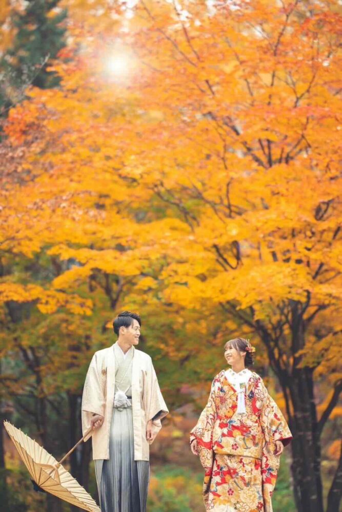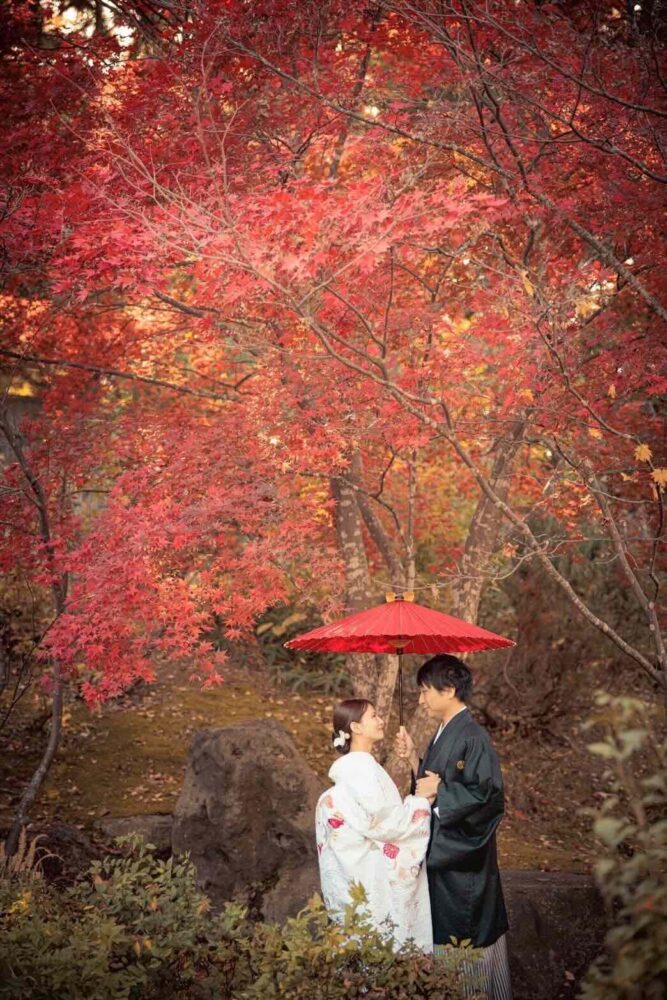 秋: 天神山緑地の紅葉が、和装・洋装どちらもドラマチックに演出します 。