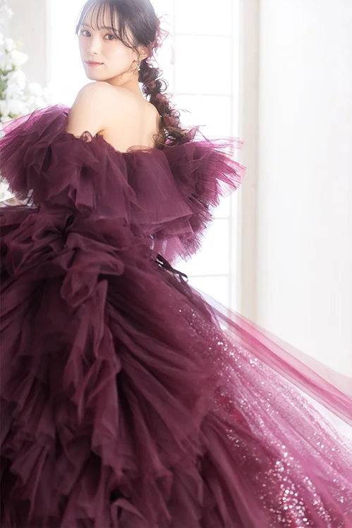 袖やチュールを組み合わせてシックで可愛らしくも美しくも着こなせる、麗しいデザイン性と色合い。