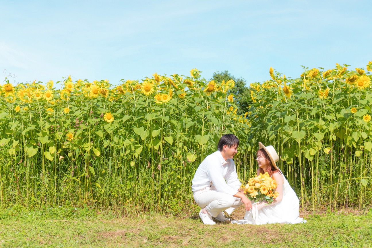 夏にブライダルロケーション撮影で人気のひまわり畑! ひまわり畑でのロケーションフォトが選ばれている理由や、実際に撮影されたお客様の声、それぞれのプランや料金、衣装選びのアドバイスまで幅広くお届け! 明るく元気なひまわりに囲まれて、ロケーションブライダルフォトはいかがですか
