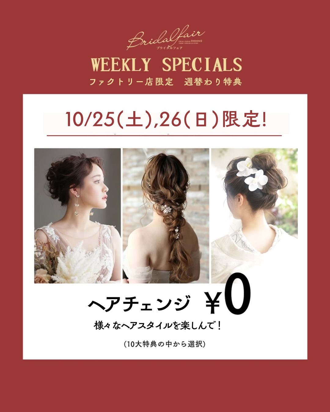 こんにちは!写真工房ぱれっとファクトリー店です! 今月も大好評の"ブライダルフェア"を毎週土日に開催しております+*. そして大好評!週替わりお楽しみ特典も開催中です。 10/25,26の特典は、 今や追加しない人はいない!あの大人気オプションが無料! ぜひチェックしてください♩