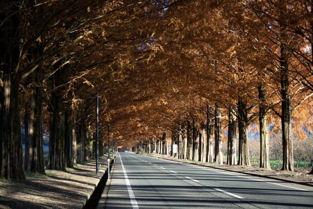 約2.4kmにわたり500本ものメタセコイアの木が一直線に並ぶ美しいスポット。