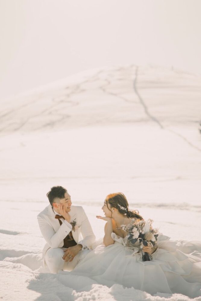 雪景色の中では、カラードレスや落ち着いたトーンのタキシードの色がよく映えておすすめですが、