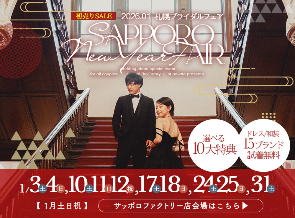 皆さんこんにちは!札幌のフォトウェディングスタジオ 写真工房ぱれっとサッポロファクトリー店です。 この度、2026年1月の毎週末に【札幌ブライダルフェア】の開催が決定いたしました!! 最新衣装の見学&無料試着会や、嬉しいプレゼント、限定特別プランを多数ご用意しております! 是非、大切な方をお誘い合わせの上ご来場をお待ちしております♡