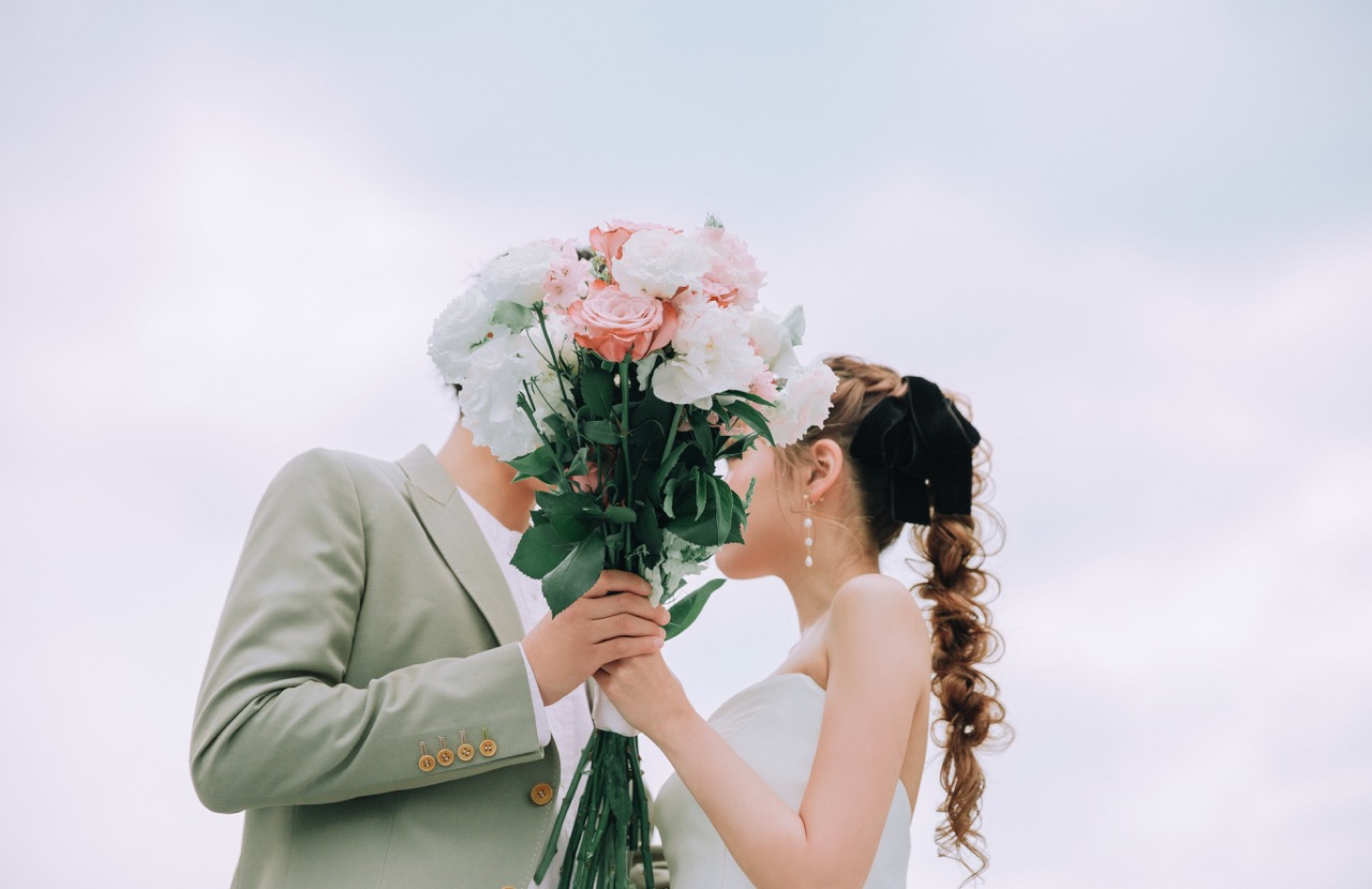 計算されたピント合わせにより、手前の白く柔らかな花々が淡く溶け込み、お二人の幸せに満ちた横顔を際立たせています!