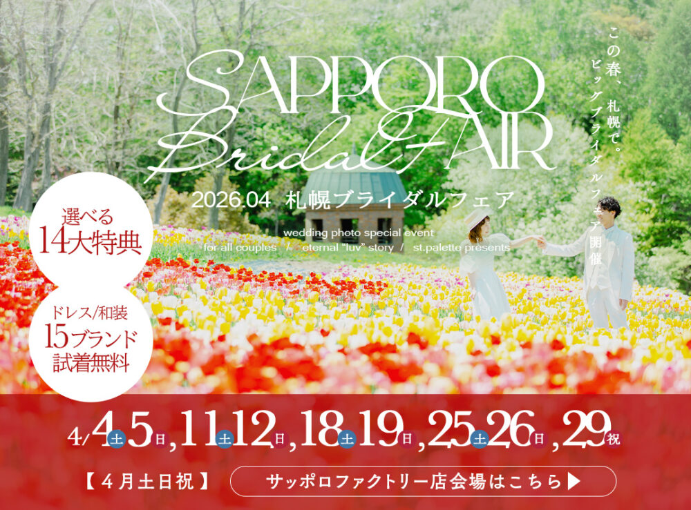 皆さんこんにちは! 札幌のフォトウェディングスタジオ 写真工房ぱれっとサッポロファクトリー店です。 この度、2026年4月の毎週末に【札幌ブライダルフェア】の開催が決定いたしました!! 最新衣装の見学&無料試着会や、嬉しいプレゼント、限定特別プランを多数ご用意しております! 是非、大切な方をお誘い合わせの上ご来場をお待ちしております♡