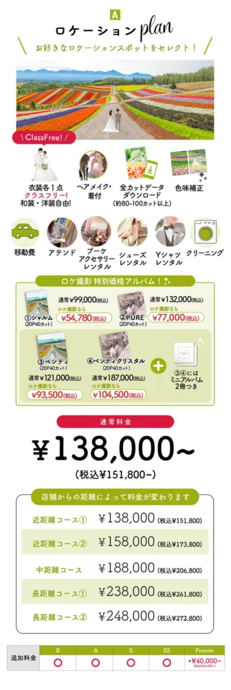 ロケーション plan: 衣装1点クラスフリーで、なんと151,800円(税込)〜。移動費やアテンド、小物レンタルもすべて含まれているので安心です 。