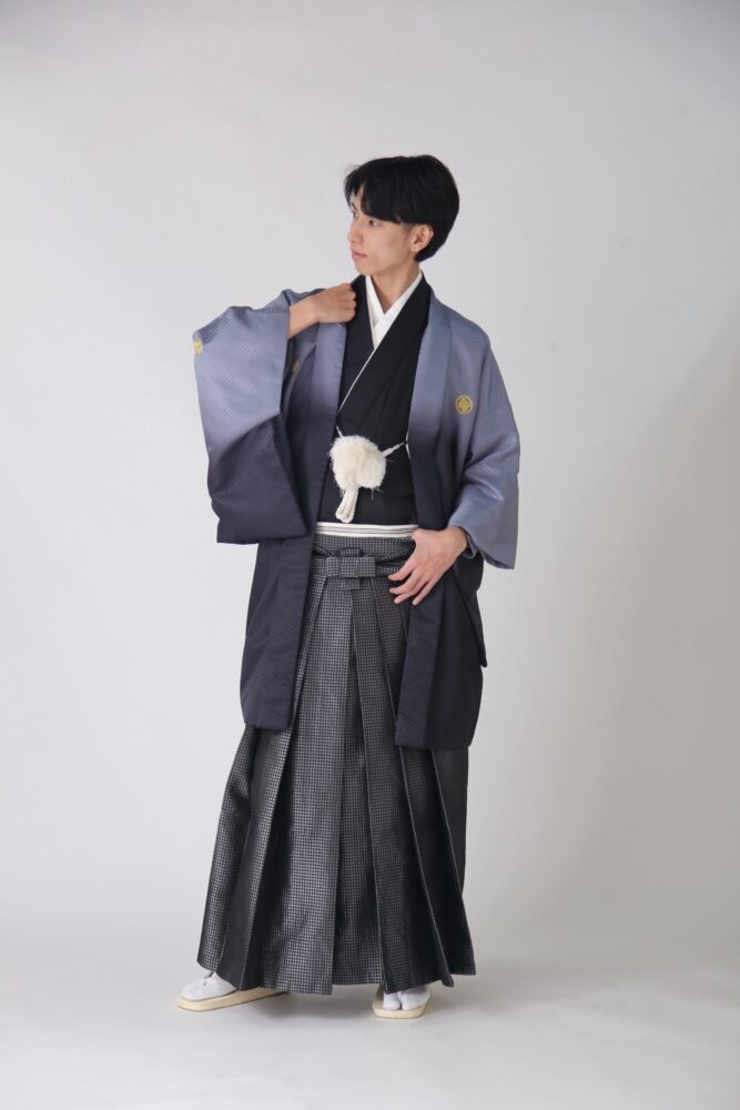 お婿様は羽織のグレー〜黒のグラデーションが印象的な1着。