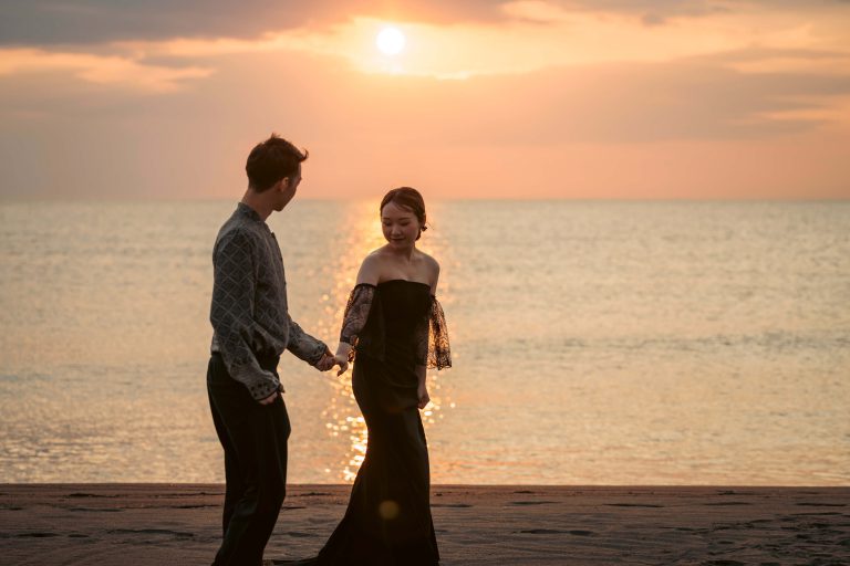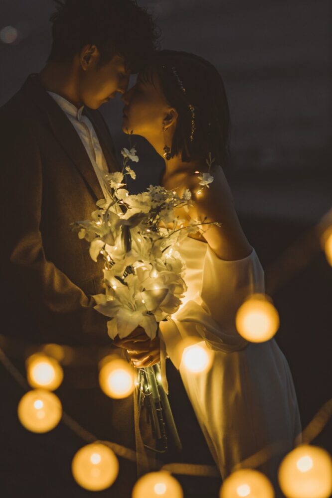 夜の海での撮影は、ふたりの新しい物語の始まりにふさわしい、魔法のような時間です。