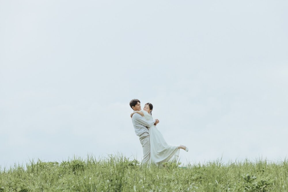 ふかふかの芝生に寝転んで、手を取り合いながら見つめ合うお二人がとってもキュート! ドレスの白と芝生のグリーンのコントラストが鮮やかで、見ているこちらまで幸せな気持ちになりますね。 足を上げた無邪気なポーズは、上野ファームのリラックスした雰囲気だからこそ撮れる特別な一枚。 「きっちりしすぎず、自分たちらしく楽しみたい!」というカップルにぜひおすすめしたいショットです。