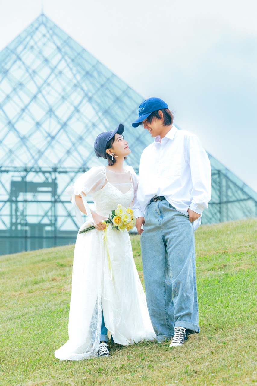 ガラスのピラミッドが放つ幻想的な輝きと、丘の上で風とひとつになるかのような開放感がお二人を祝福するこの場所で、数十年後に見返してもあの日の自由な鼓動とときめきが鮮やかに蘇るような、一生もののウェディングフォトを残してみませんか?