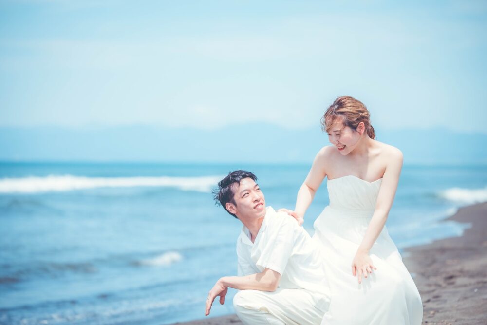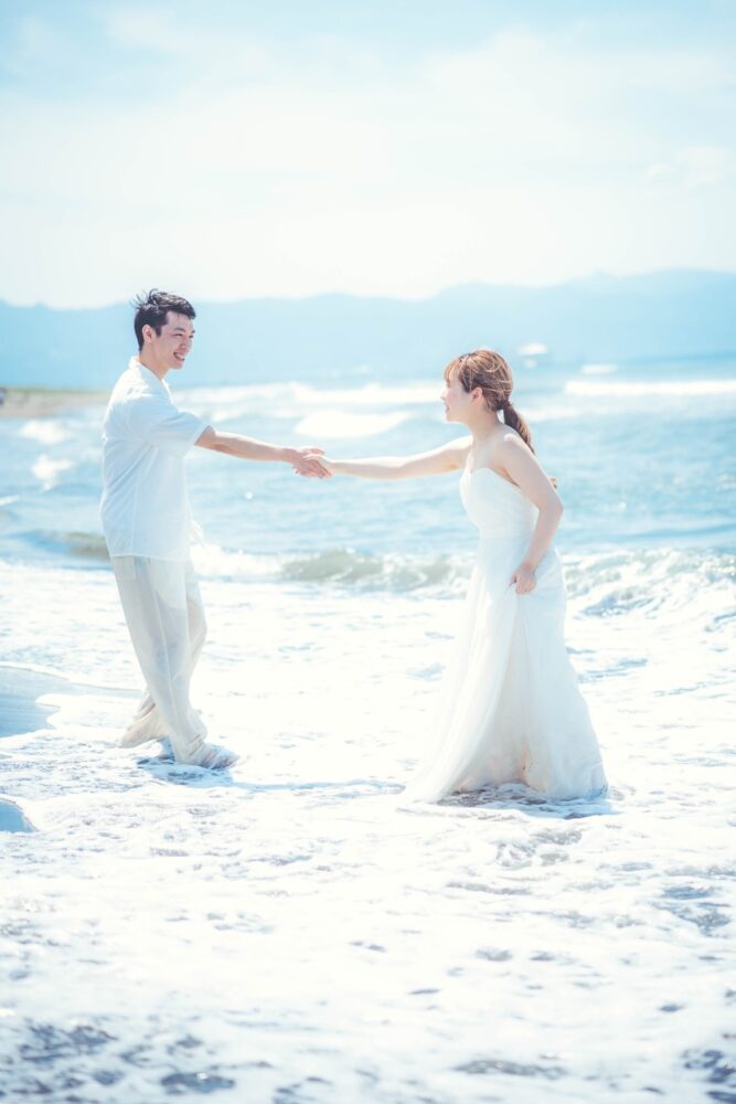 波打ち際でおふたりが自然に笑い合う姿は、まさに映画のワンシーンのよう。