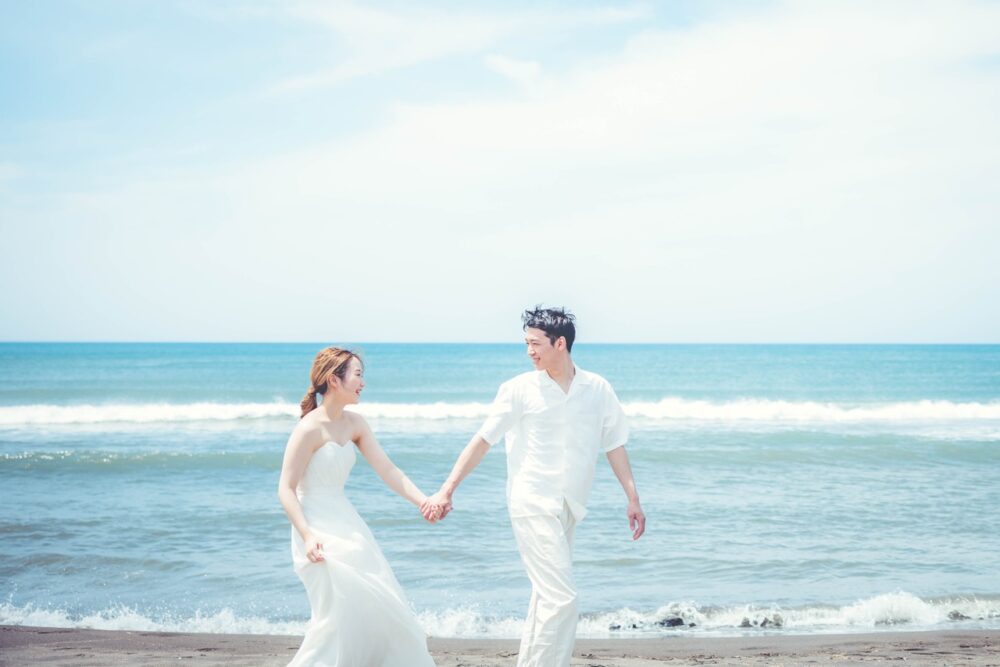 太陽の光を浴びて輝く海をバックにすれば、ウェディングドレスの白さがより一層際立ち、明るくヘルシーな印象の写真を残せます。