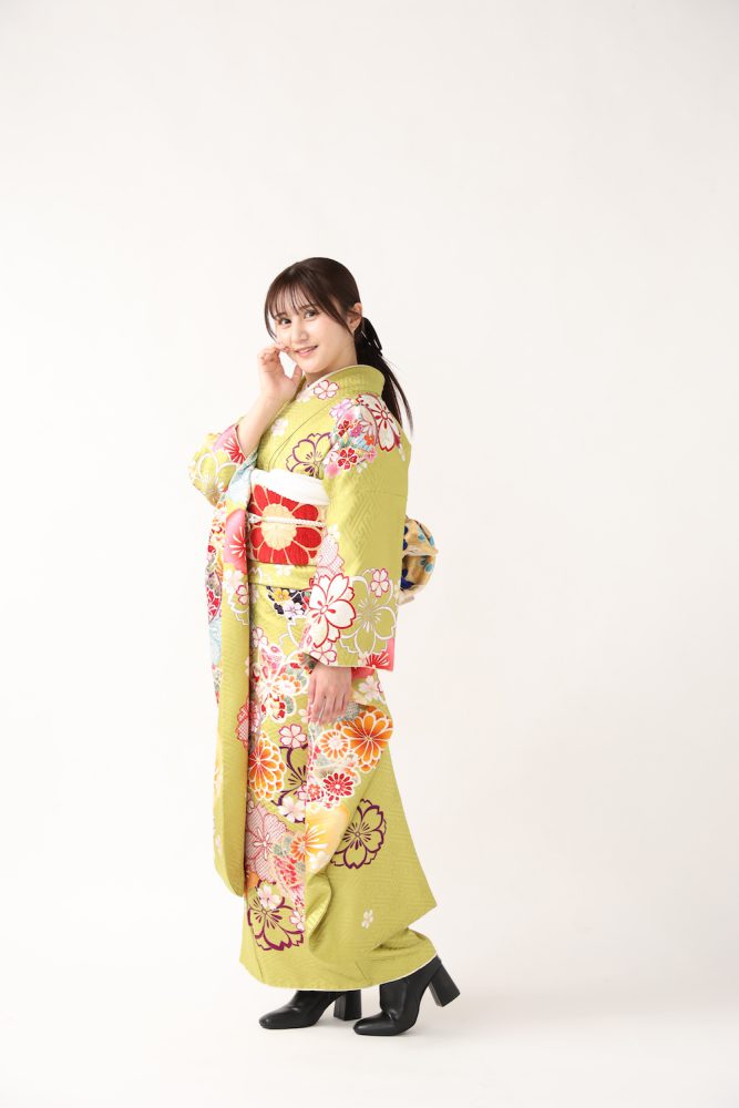 明るいグリーンの振袖は、ハタチらしい華やかな1着。