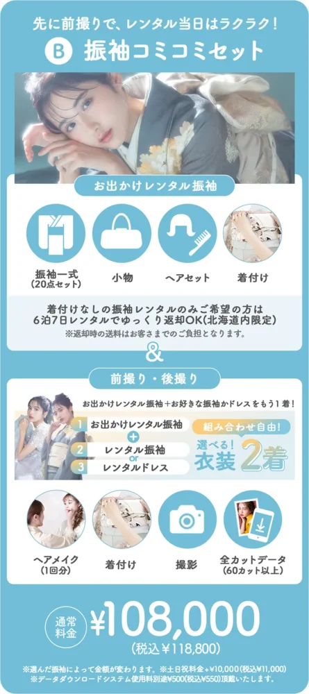 「成人式の準備って、結局いくらかかるの?」と不安な親御様も多いはず。一番人気の「振袖コミコミセット」は、式当日レンタルと前撮りがセットになって118,800円(税込)からご用意しています 。