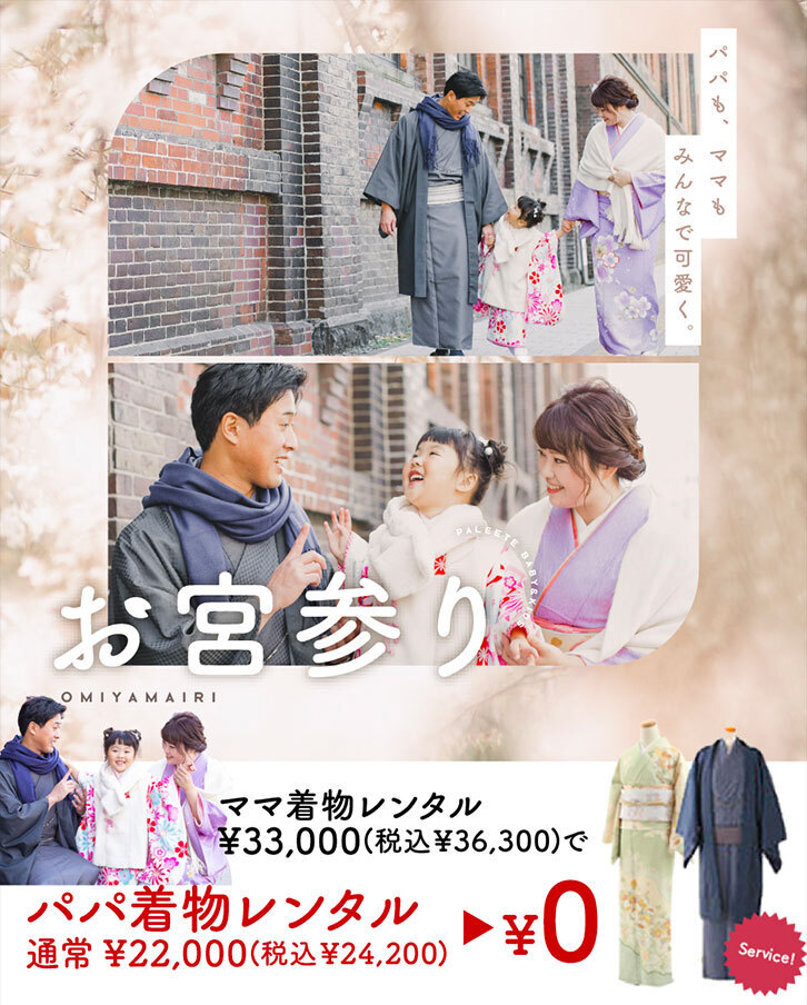 せっかくなら家族揃って着物を着たいですよね!なんとぱれっとは4月のキャンペーンでママ着物のオプション追加でパパの着物を無料着付けキャンペーンの実施が決定いたしました!