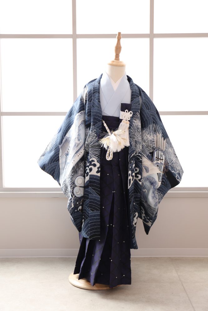 袴、羽織着物共にネイビー系のカラーが入っていて落ち着いた配色がかっこいい1着。