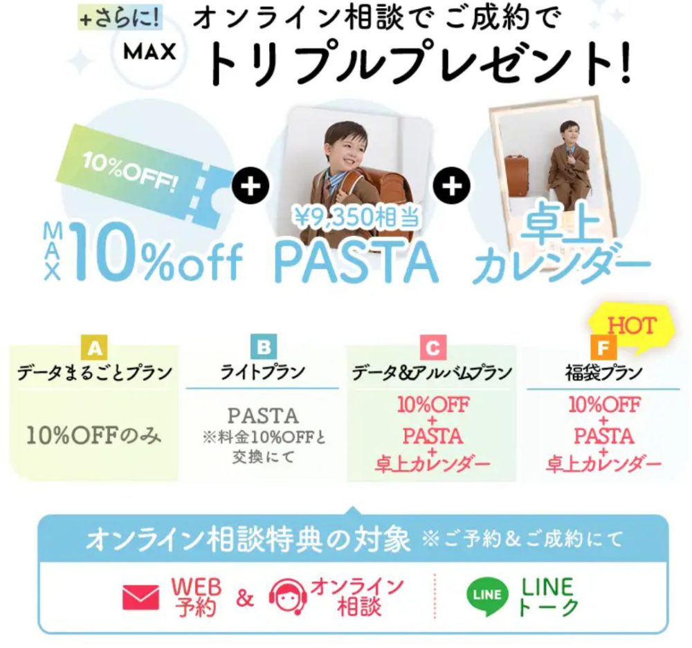 無料オンライン相談+ご契約をしてくださった方全員に「10%オフ」やプランによってもついてくる「特典」など大変お得となっております!!
