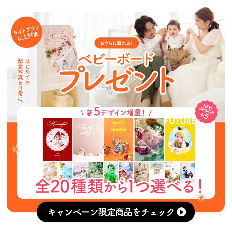 全20種類のデザインをご用意。はじめての記念写真を日常に気軽に飾っていただけるボードとなっております!