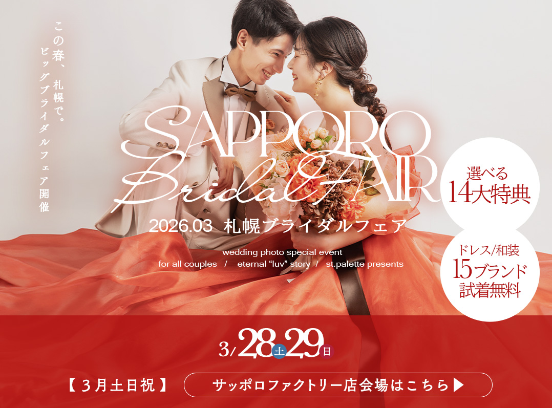 皆さんこんにちは! 札幌のフォトウェディングスタジオ 写真工房ぱれっとサッポロファクトリー店です。 この度、2026年3月の毎週末に【札幌ブライダルフェア】の開催が決定いたしました!! 最新衣装の見学&無料試着会や、嬉しいプレゼント、限定特別プランを多数ご用意しております! 是非、大切な方をお誘い合わせの上ご来場をお待ちしております♡